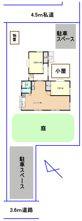 | 接道状況 | 北東側幅員4.5m私道、南西側幅員3.6m道路に面す |